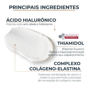Eucerin Hyaluron-Filler+Elasticity Creme Antirrugas Dia FPS 30 preenche rugas profundas, linhas de expressão e hidrata com o Ácido Hialurônico. A fórmula também inclui Thiamidol, ativo eficaz para tratar a causa raiz das manchas, Complexo Colágeno-Elastina, que acelera a produção do colágeno e melhora a elasticidade da pele, e Filtro UVA (FPS 30), que previne o envelhecimento causado pela radiação solar. Com resultados visíveis em apenas 2 semanas, tem textura creme e de rápida absorção. É ideal para todos os tipos de pele, especialmente as maduras e menopausadas.NART: 83568-03400-05