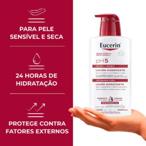 Eucerin pH5 Loção Hidratante Corporal é ideal para hidratação profunda e de longa duração. Desenvolvido com Dexpantanol, Glicerina e Vitamina E, restaura as defesas naturais da barreira da pele e protege contra fatores externos. Ajuda a manter o equilíbrio do pH da pele. Sua textura é leve e não deixa resíduos, ideal para peles sensíveis e secas.